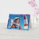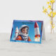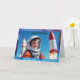 A frente deste cartão de aniversário mostra um jovem vestido com um terno astronauta laranja brilhante, completo com um capacete e uma bandeira americana na manga. Ele está sorrindo alegremente, em pé contra um pano de fundo de foguetes prontos para lançamento. O céu azul vívido enfatiza o tema espacial, com um foguete decolando visivelmente, simbolizando aventura e exploração. As palavras "Parabéns" são exibidas no topo em uma fonte azul chamadora de olhos com um contorno preto, combinando-se perfeitamente com a configuração de espaço. O cartão é emoldurado com um vibrante design de galáxias brilhantes de blues e roxas, acrescentando um toque cósmico brilhante. Esta carta é perfeita para uma criança que ama o espaço, foguetes, e sonhos de explorar o universo, fazer-a uma escolha fantástica para um aniversário cheio de imaginação e entusiasmo.
