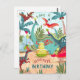 Um cartão de aniversário de dinossauro pintado à mão com dinossauros numa selva pré-histórica. Arte original de Caroline Bonne Müller.