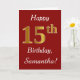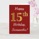 Este simples cartão de aniversário apresenta a mensagem "Feliz 15 de Aniversário", com o "15" a ter uma aparência falsa de ouro. Também apresenta um nome personalizado e um fundo vermelho escuro. Pode ser dado a alguém que comemora o seu décimo quinto aniversário.