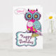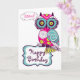 Uma ilustração de coruja de ornamentado verde, rosa-quente, azul e púrpura escura com padrões florais. É um cartão de aniversário divertido e feminino para a sua família e amigos.