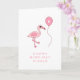 Um cartão de sexto aniversário fofo e caprichoso que apresenta uma ilustração vetorial de uma ave rosada do flamingo. O trabalho de arte está em um estilo kawaii e tem uma sensação feminina e bonito. O texto na frente do cartão diz "Feliz Dia do Pássaro", um trocadilho na frase Feliz Aniversário, seguido do nome do destinatário. Um balão de aniversário exibe o número 6 para significar sua idade. Há um padrão flamingo na dentro do cartão e espaço para uma mensagem personalizada.