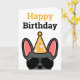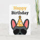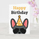 Buldogue francês de cor azul vestindo um chapéu de festa amarelo e óculos escuros de aviador.