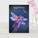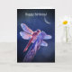 Um belo cartão mágico de aniversário com uma libélula e lua crescente. Dentro: Que seu aniversário seja tão extraordinário, incrível, único, excepcional, especial, divertido e notável quanto você é!
