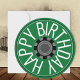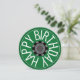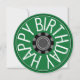 Diga Feliz Aniversário no estilo retroativo do vapor com este cartão redondo de saudações. O cartão é verde-escuro com um design como uma roda, uma engrenagem ou uma engrenagem, ideal para os fãs de galhardetes e os entusiastas do trem de safra. A saudação de "Parabéns" aparece em na moda retro lettering, a branco, num círculo à volta da borda da design. Os detalhes das cinzas de aço e carvão acrescentam-se ao tema industrial da safra. A parte traseira do cartão tem espaço em branco suficiente para sua própria mensagem.