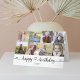 O moderno cartão de saudação de aniversário feliz apresenta 10 fotos. 8 na frente, 1 dentro e 1 na parte traseira da placa.