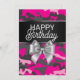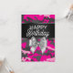 Cartão de aniversário personalizado com "Parabéns" em tipografia mista, arco prateado, fita de cetim preto e fundo de camuflagem rosa.