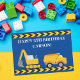 Legal cartão de aniversário feliz da escavadora de construção, para um garoto que ama veículos de construção amarelos em preto e amarelo. Divertido decoração de veículos azuis para crianças que adoram carros e caminhões de lixo. Personalize com o nome do seu filho sob a fita de precaução preta e amarela com uma mensagem de aniversário feliz personalizada, incluindo o nome e a idade.