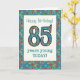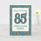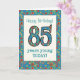 Um Cartão de Aniversário específico da Idade bonito para uma criança de 85 anos, com o número 85 e a fronteira preenchida com um padrão retrorfloral colorido num fundo lacrimogêneo. O padrão floral é parte da coleção 'Impressão de avó' Posh & Painterly, de uma colagem de papel pintada manualmente por Judy Adamson. Este design ajustado todos os tamanhos da placa de saudação.