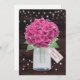 Cartão de aniversário floral cor-de-rosa doce, de cor roxa, com hydrangeas cor-de-rosa e um jarro de dentro de hálito de bebê contra um fundo de madeira rústica. As lanternas e as estrelas cintilantes adicionam um charme mágico a este design floral fofo. Um crachá floral com texto personalizado 'Feliz Aniversário' na frente e um grande coração floral com uma mensagem no verso.