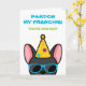 Se você conhece alguém que ama buldocos franceses e tem um bom senso de humor, este engraçado cartão de aniversário francês é ideal para enviá-los no seu dia especial. A design apresenta uma ilustração ao estilo cartoon de um buldogue francês de cor preta vestindo um chapéu de festa e óculos de sol com a frase "Perdão meu frenchido! Você tem quantos anos?" escrito na frente. Este design também está disponível com diferentes Bulls franceses de cor diferente.