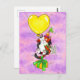 Um adorável gato malhado, que está usando um chapéu de festa e segurando um buquê de flores brancas em uma das patas e um presente com o rabo, está sendo puxado para o ar por um grande balão amarelo em forma de coração. O fundo é rosa e roxo como um céu noturno.