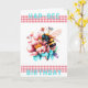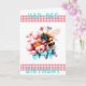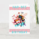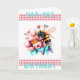 Cartão de Aniversário Hap-Bee. Um impressão de aquarela de uma abelha coletando pólen de flores bonito. Uma fita de gingham, de cor vermelha-pitada, tanto acima como abaixo da imagem principal, com as palavras "Aniversário de Hap-Bee" numa turquesa. As cores principais são vermelho, turquesa, amarelo. Na dentro da mensagem lê-se, "aproveite seu dia especial." Esta mensagem pode ser personalizada para escrever as suas próprias palavras especiais.
