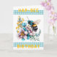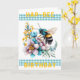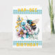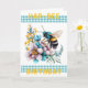 Cartão de Aniversário Hap-Bee. Um impressão de aquarela de uma abelha pairando sobre flores bonito. Uma tira de gingham turquesa, tanto acima como abaixo da imagem principal, com a menção "Aniversário da Abelha-Hap" em amarelo escuro. As cores principais são turquesa, amarelo e roxo mudo. Dentro, a mensagem diz: "Desejo-lhe um dia maravilhoso." Esta mensagem pode ser personalizada para escrever as suas próprias palavras especiais.