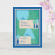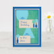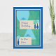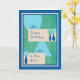 Esta design tem caixas, quadrados, círculos e triângulos, todos cercados por pequenos pontos e adornada com pequenos vasos de flores. Isso poderia ser comprado para homens ou mulheres por causa da design única. As cores do cartão são azul, verde e bege.