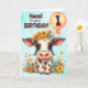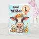 Cartão de Aniversário para Crianças de Vaca Bonita - uma vaca engraçada e fofa está sentada, cercada por flores, e um balão com um dentro. O fundo é uma aquarela brilhante e turquesa. A mensagem na frente diz 'nome' é seu BIRTHDAY e o número no balão pode ser alterado para a idade da criança. Dentro no cartão, a mensagem "aproveite seu dia especial" - essa mensagem também pode ser alterada. A parte traseira do cartão é a mesma cor d'água com o balão laranja.