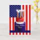 Cartão de aniversário em vermelho, branco e azul com um bolo, velas e uma bandeira dos EUA no fundo. Obrigados para Pixabay e Hungryjpeg para alguns dos elementos do design. Todas as palavras no cartão podem ser alteradas.