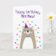 Cartão de Aniversário para Mee Maw. Se você chama sua avó Mee Maw em vez de vovó, este cartão de aniversário é perfeito para ela. O vosso chefe de família vai adorar o design bonito, moderno, colorido, ao estilo escandinavo, deste cartão de aniversário, que inclui um ursinho de ursos castanho e cinza com um chapéu de festa roxo e boliches e um confete rosa, amarelo e azul com o texto "Feliz aniversário, Mee Maw!" Torne este cartão personalizável! Clique em "Editar Design", "Dentro Inferior/Direita: Texto e imagens", "Texto" e "Adicionar texto" para escrever a sua própria mensagem personalizada e personalizada para Mee Maw dentro!