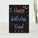 Você chama seu pai de Pare, não de Papai. (Pare significa pai em catalão e vêneto.) Imagine como o Pare ficará animado ao receber um cartão de aniversário dirigido especialmente a ele! Seu pare também vai adorar o design colorido inspirado em fogos de artifício (amarelo, rosa, azul e roxo em fundo preto) que diz "Feliz aniversário, Pare!"