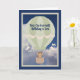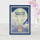 Cartão de aniversário para uma criança de um ano e meio com um macaco giro num balão de ar quente verde claro, vindo dar abraços de macaco à criança. O fundo é um céu azul profundo com nuvens. Obrigados à hungryjpeg para alguns dos elementos da design.
