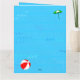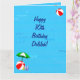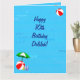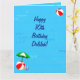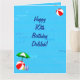 Um cartão de aniversário para Delilah com um tema divertido de piscina, decorado com uma bola de praia vermelha, guarda-chuva verde, sandálias e óleo de bronzeamento em um fundo azul aquático com ondas encaracoladas.