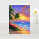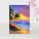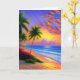 Cartão de aniversário tropical com um pôr do sol espetacular, palmeiras e ondas do oceano. Personalize com seu próprio ditado, se quiser.
