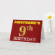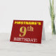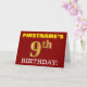 Este design de cartão de saudação de aniversário apresenta uma mensagem como "FIRSTNAME'S 9th BIRTHDAY!", com o "9º" a ter uma aparência falsa e imitada de cor dourada. O nome do destinatário na frente pode ser personalizado, e o fundo frontal é vermelho colorido. Também apresenta uma mensagem de saudação de aniversário personalizada no dentro. Um cartão de cumprimentos de aniversário como este talvez pudesse ser dado a alguém em comemoração do seu nono aniversário. [~Z0000184]