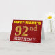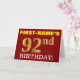 Este design de cartão de saudação de aniversário apresenta uma mensagem como "FIRST-NAME'S 92nd BIRTHDAY!", com o "92º" a ter uma aparência falsa/imitada de cor dourada. O nome do destinatário na frente pode ser personalizado e o fundo frontal é vermelho colorido. Também apresenta uma mensagem de saudação de aniversário personalizada no dentro. Um cartão de cumprimentos de aniversário como este talvez pudesse ser dado a alguém em comemoração do seu nonagésimo segundo aniversário. [~Z0000184]