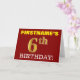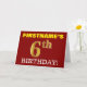 Este design de cartão de saudação de aniversário apresenta uma mensagem como "PRIMEIRO DIA DE 6 DO FIRSTNAME!", com o "6" a ter uma aparência de cor falsa/imitada de ouro. O nome do destinatário na frente pode ser personalizado, e o fundo frontal é vermelho colorido. Também apresenta uma mensagem de saudação de aniversário personalizável no dentro. Um cartão de aniversário como este talvez pudesse ser dado a alguém em comemoração do seu sexto aniversário. [~Z0000184]
