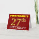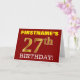 Este design de cartão de saudação de aniversário apresenta uma mensagem como "PRIMEIRO NOME'S 27th BIRTHDAY!", com o "27º" a ter uma aparência de cor falsa/imitação em forma de ouro. O nome do destinatário na frente pode ser personalizado e o fundo frontal é vermelho colorido. Também apresenta uma mensagem de saudação de aniversário personalizável no dentro. Um cartão de aniversário como este talvez pudesse ser dado a alguém em comemoração do seu vigésimo sétimo aniversário. [~Z0000184]