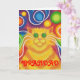 Querida Groovy! Um gato listrado amarelo e laranja com bigodes giratórios e um fundo de arco-íris psíquico com padrão. Cartão de saudação com um design personalizável amarelo, laranja, vermelho, azul, verde, rosa, roxo e branco para que você personalize com seu próprio texto, imagens e ideias.Um desenho colorido digitalmente aprimorado original de Jess Perry.