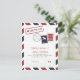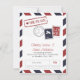 Cartão de Antecipação de Data Inspirado em Correio Aéreo em Vermelho e Azul. Marca de Selo Falso e Marcações de Postagem para um Casamento com Tema de Viagem.