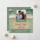 Vibrações modernas de praia em verde sálvia e azul turquesa com foto, letras de areia para salvar a data e foto personalizada. NOTA: Texto, fonte, cores e elementos são totalmente personalizáveis usando a ferramenta de design.