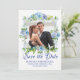 Mostre a foto do casal favorito enquanto anuncia a data do seu casamento. Uma moldura romântica envolve sua foto. Lindas flores azuis e brancas criam um clima romântico. 'Save the Date' é escrito abaixo em uma fonte de letra formal e sofisticada. Seus nomes estão em letras maiúsculas. A data e o local seguem. Muito fácil de inserir sua própria foto e texto.