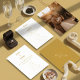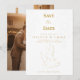 Cartão clássico de anúncio de data de casamento com um design elegante de pombo branco e dourado. Um cartão lindamente dobrado para anunciar a data do seu casamento num estilo atemporal e refinado. Impresso plano — sem relevo ou textura elevada. Totalmente personalizável com os detalhes do seu evento.