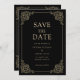 Cartão de data de casamento islâmico muçulmano. Cartão de cor preta com fonte dourada na frente. Quadro de moldura barroca vintage anúncio que pode ser usado para a cerimônia Nikah, Mehndi e Walima. Personalize a cor, tipo e tamanho das fontes com a ferramenta de design da Zazzle. Você pode editar a frente e o verso do cartão. Você pode escolher um tipo de papel.