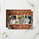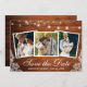 Cartão de Anúncio de Noivado de Data de Salvamento de Luzes de Corda e Renda com 3 Fotos em Madeira Rústica