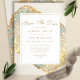 Este cartão de anúncio de data chic apresenta um deslumbrante design de brilho iridescente em tons dourados e pastéis cintilantes. A tipografia elegante e os acentos cintilantes criam um visual sofisticado, perfeito para anunciar seu dia especial com estilo. Personalizável com detalhes do casamento, este lindo cartão adiciona um toque de glamour e charme à papelaria do seu casamento.
