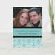 Cartão de anúncio de noivado com foto com um padrão contemporâneo e elegante de damasco floral clássico em azul turquesa, preto e branco, único e sofisticado, personalizável com seus nomes e sua própria foto, a maneira perfeita de compartilhar sua notícia feliz com familiares e amigos.