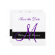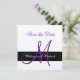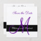 Faixa preta com inicial roxa em um papel metálico prateado. Cartão Simples de Salvar a Data com monogramas. Elke Clarke© Criado para a Galeria de Monogramas. O modelo de anúncio de salvar a data é totalmente personalizável com o estilo de fonte, cores, tamanhos de papel e estoque de papel. Itens correspondentes na loja. Contate luxuryweddinginvitations@gmail.com para ajuda.