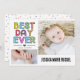 Celebre a chegada do seu pequeno com o nosso Cartão de Anúncio de Nascimento do Melhor Dia de Todos. Este cartão encantador mostra duas fotos preciosos do seu recém-nascido na frente, complementadas por tipografia divertida revelando o nome do seu bebê e os detalhes de natalidade. A parte de trás do cartão é enfeitada com pontos de confete coloridos do arco-íris pastel, acrescentando um toque delicioso a este anúncio especial. Compartilhe a alegria do seu melhor dia com a família e amigos com esta adorável e personalizada saquê.