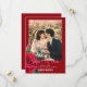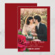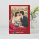 Cartões de aviso com antecedência de casamento com modelo de foto. Toda a redação está na parte inferior, em fontes escritas e impressas brancas. Os primeiros nomes do casal se destacam em texto maiúsculo e negrito. Uma rosa vermelha realista e um botão de rosa decoram a borda. Adicione uma foto vertical (retrato) para melhores resultados. Escolha também a opção de download instantâneo para compartilhar anúncios de casamento online.