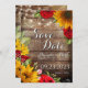 Cartão de Anúncio de Noivado Girassol & Rosas. Anuncie seu noivado com estilo com nosso Cartão de Anúncio de Casamento Rústico. Apresenta um fundo de madeira marrom com verde espalhado por toda parte, bem como girassóis amarelos e rosas vermelhas.