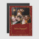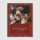 Confetes dourados decoram o fundo vermelho borgonha na frente e no verso. Três fotografias do casal são apresentadas na frente. Todo o texto abaixo, incluindo o grande Estamos Noivados, pode ser editado para personalizar seu anúncio de noivado único.