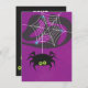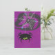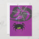 Uma aranha preta com olhos verdes brilhantes pendura de uma teia contra um fundo roxo vibrante. A rede apresenta pontos cintilantes, acrescentando um toque caprichoso. Essas placas personalizadas são convites para baratos, folhetos em sala de aula, truque ou tratamento ou favoritos para festas. Disponível com ou sem envelopes. Professores, deem aos seus alunos um cartão especial da sua sala de aula. Forneça aos tratadores um alternativo doce divertido. Use como um convite ou dê a cada criança uma vigilância para levar para casa do seu partido. Imagem digital do papel pintado à mão. Anterior: Adicionar texto personalizado.
