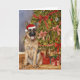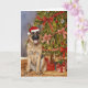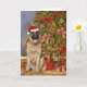 Este cartão de Natal apresenta um retrato aquoso de um Cachorro German shepherd vestindo um chapéu de Papai Noel sentado debaixo de uma árvore de Natal.