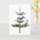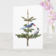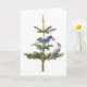 Um jay azul esfrega passa um doce vermelho e branco de menta em um jay branco em uma árvore de abeto. Mande suas "saudações da temporada" com este cartão de feriado de pássaro.