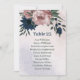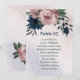 Cartão de número de mesa de assento exclusivo com flores românticas rosa e azul marinho e folhas verdes.