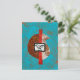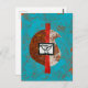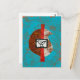 Ilustração engraçada de ave sobre uma forma colada marrom e bege com faixa laranja no centro - tudo sobre um fundo texturizado turquesa e laranja.