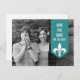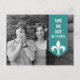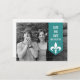 Cartão de Aviso de Data de Casamento moderno e elegante com Banner Chic Flourish com uma faixa em turquesa adornada com um simples ornamento de flor-de-lis. Este cartão de aviso de data de casamento é perfeito para anunciar seu casamento. Fácil de personalizar, basta adicionar sua própria foto e detalhes do casamento. Clique em "Personalize" para encontrar opções adicionais de personalização.