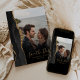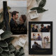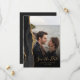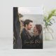 A borda esquerda deste elegante cartão moderno de "save the date" de casamento apresenta uma borda de ágata em aquarela preta aparada com brilho dourado falso. A sobreposição de texto personalizável combina fontes de letra manuscrita dourada e cobre sobre sua fotografia. Um filtro gradiente preto ajuda a fazer o texto se destacar. O verso fornece espaços para cinco fotos adicionais (uma quadrada, três horizontais e uma vertical), juntamente com o URL do seu site de casamento ou outra mensagem em texto dourado sobre um fundo preto-claro. Substitua facilmente as imagens de amostra com suas próprias fotos.